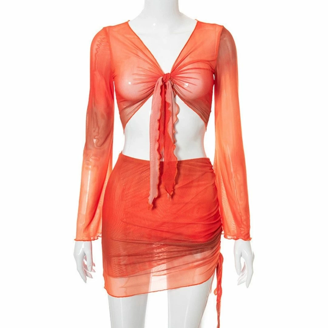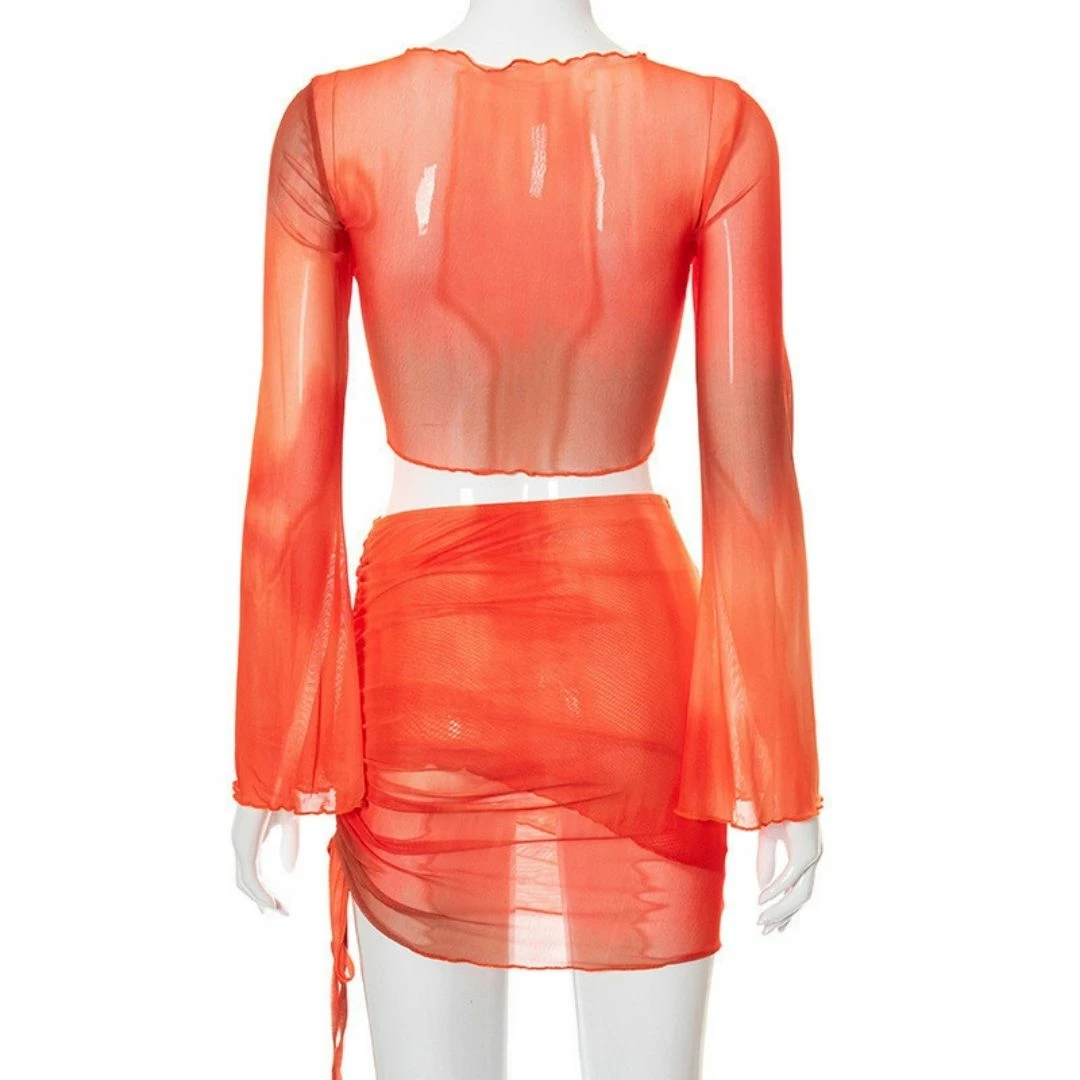 Featuring thick mesh fabric on the tie front bell sleeve crop top and a double layered skirt with side ruching and asymmetric detail.