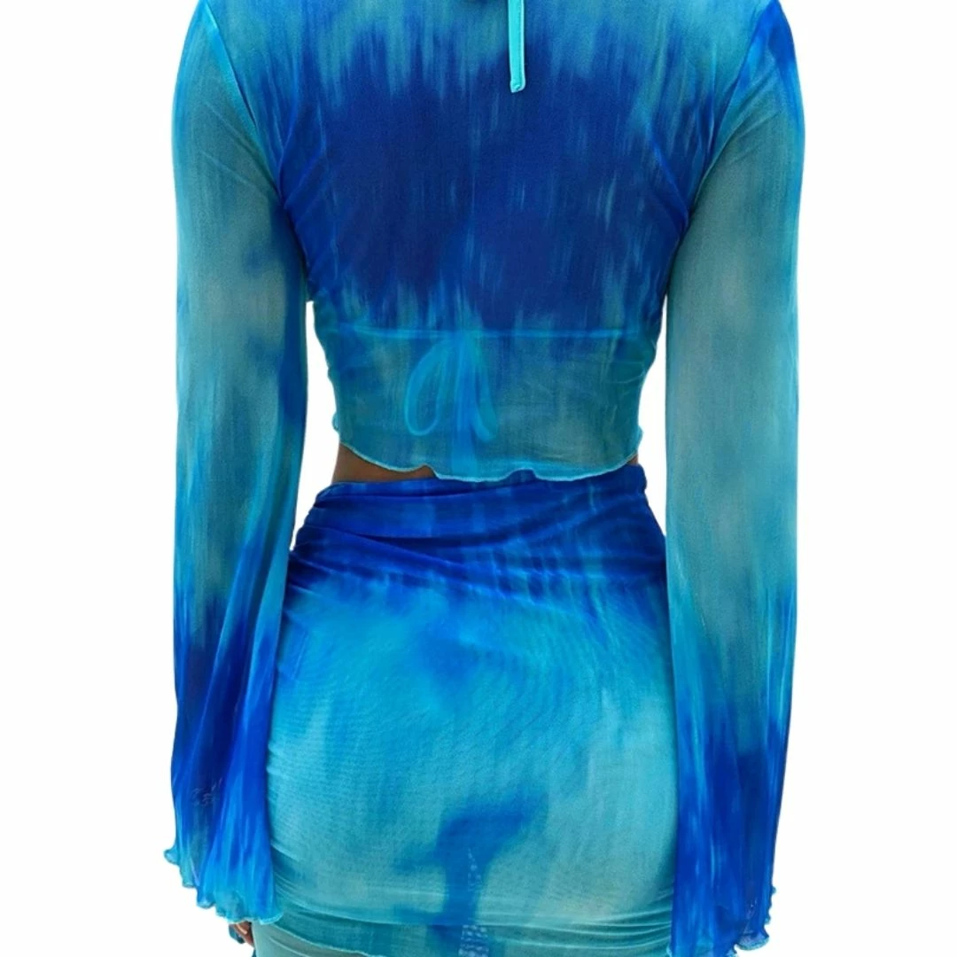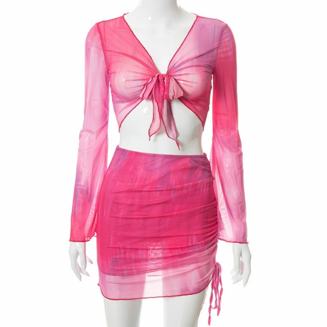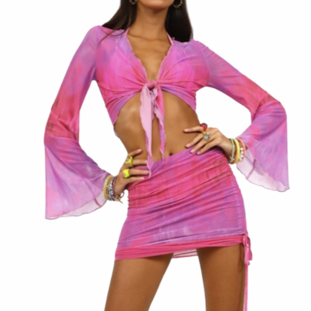 Featuring thick mesh fabric on the tie front bell sleeve crop top and a double layered skirt with side ruching and asymmetric detail.