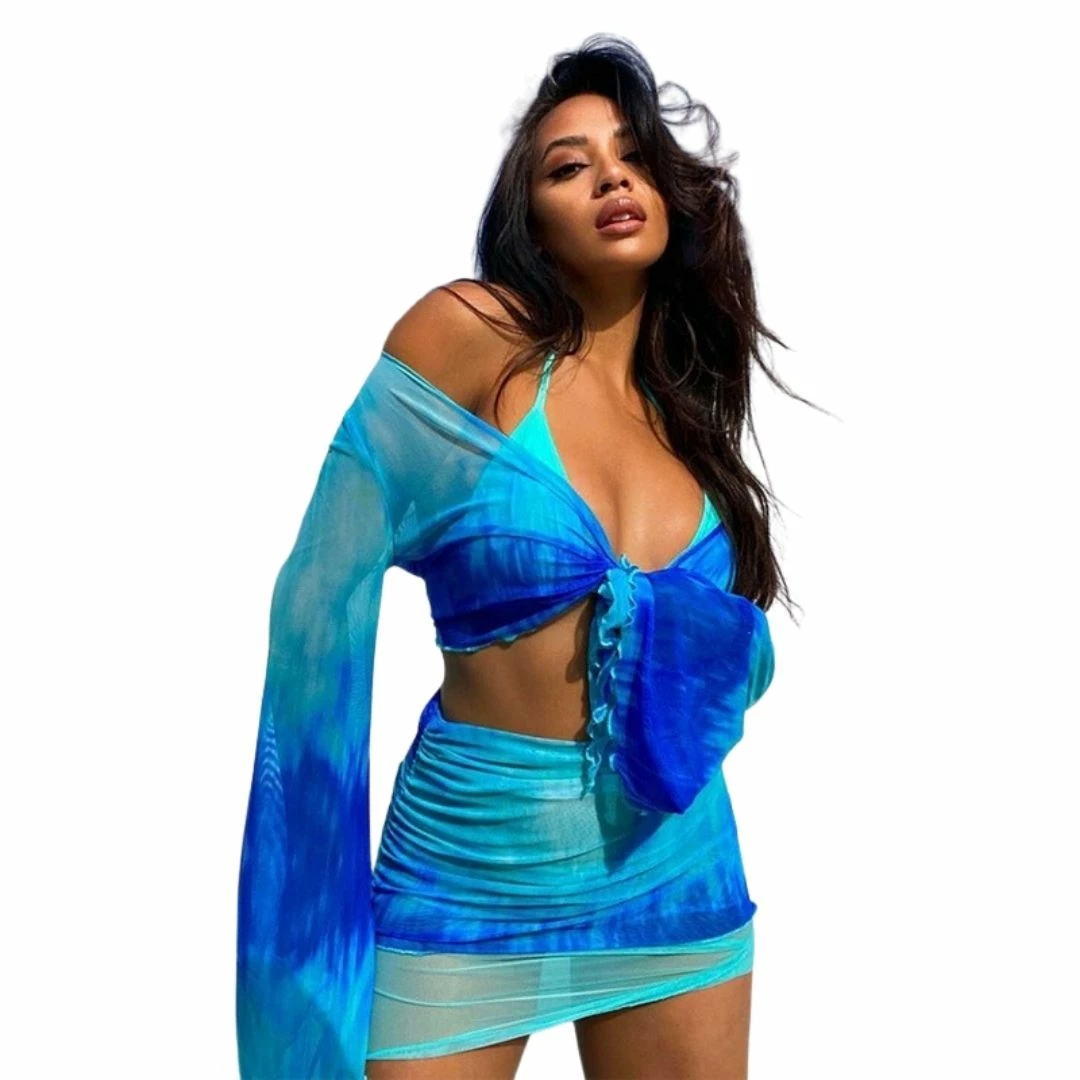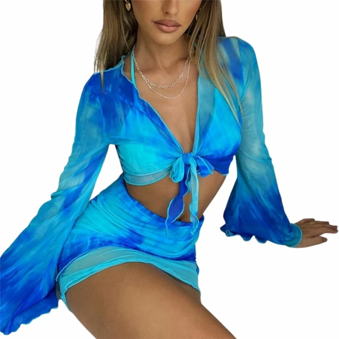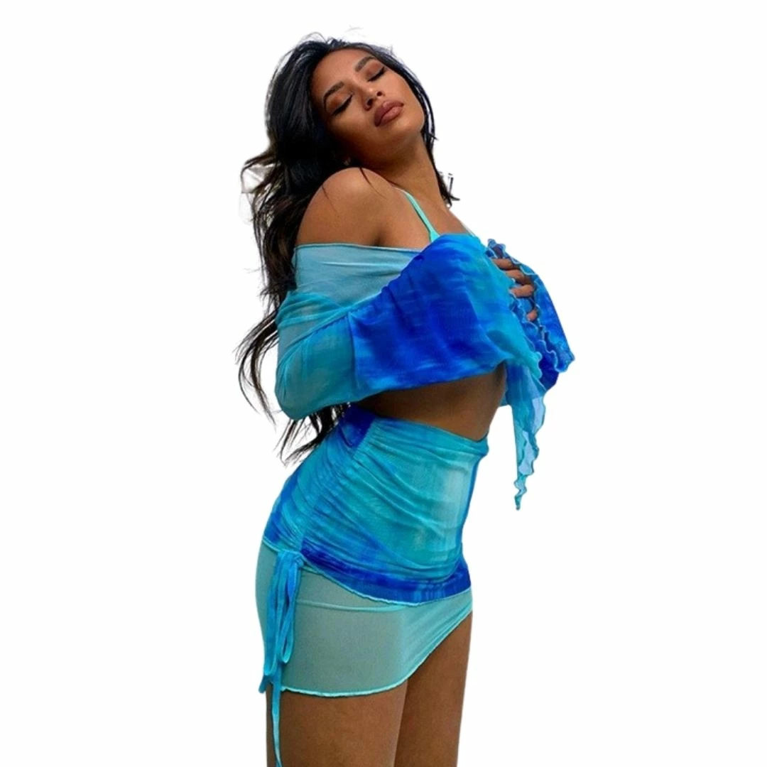 Featuring thick mesh fabric on the tie front bell sleeve crop top and a double layered skirt with side ruching and asymmetric detail.