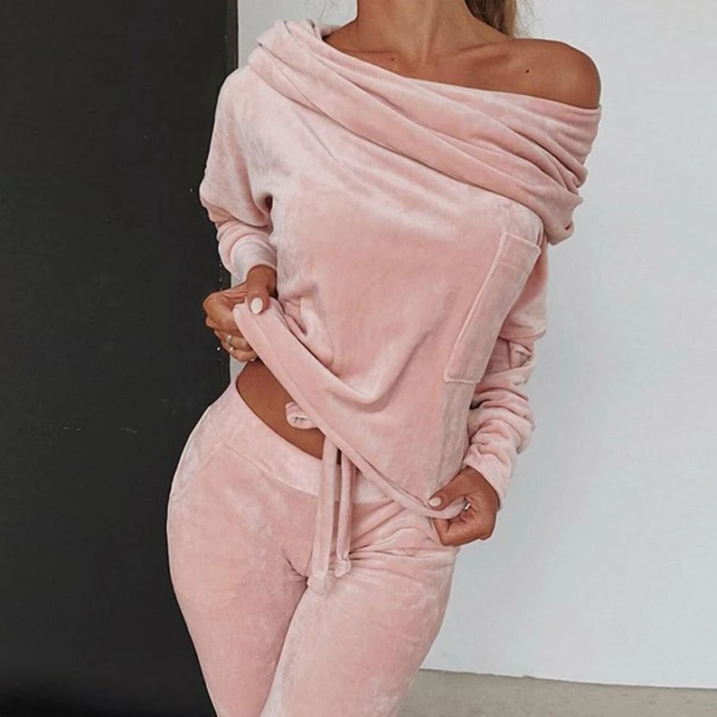 Get cosy in our cosiest of sets for home or daywear, our super comfortable velour off the shoulder tracksuit is the set you’ll never want to take off this winter.