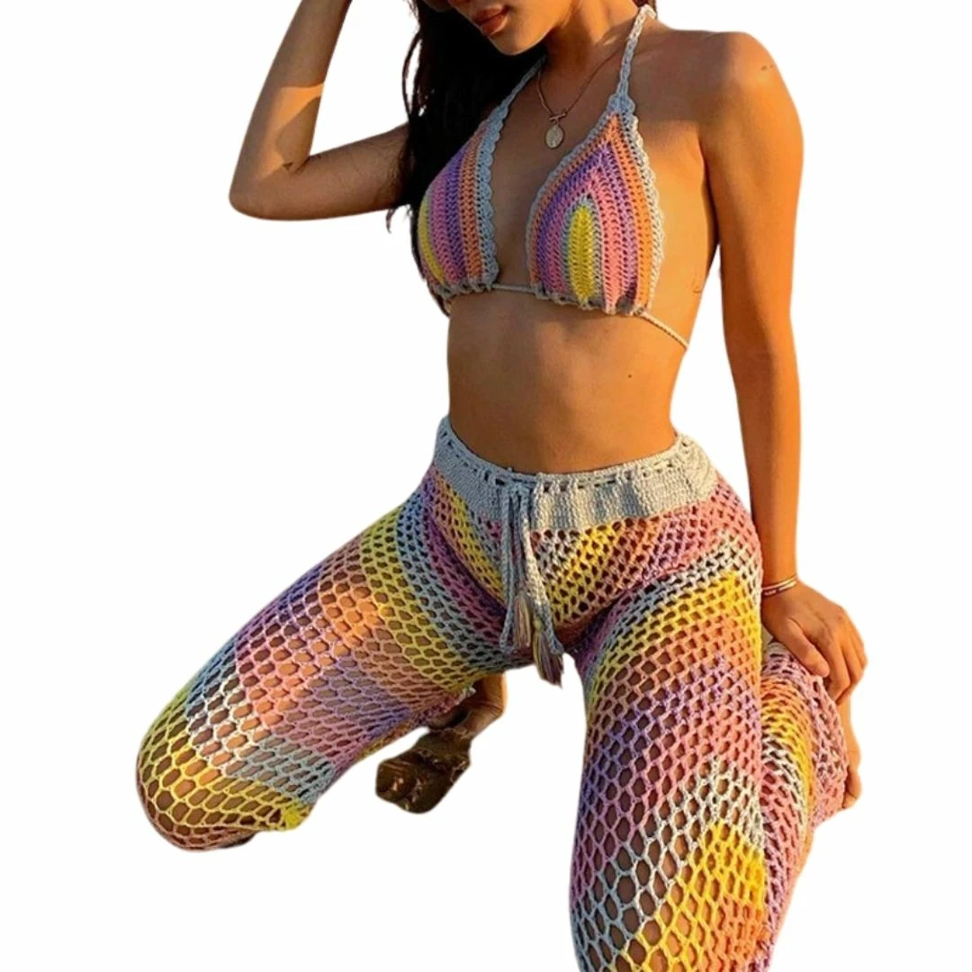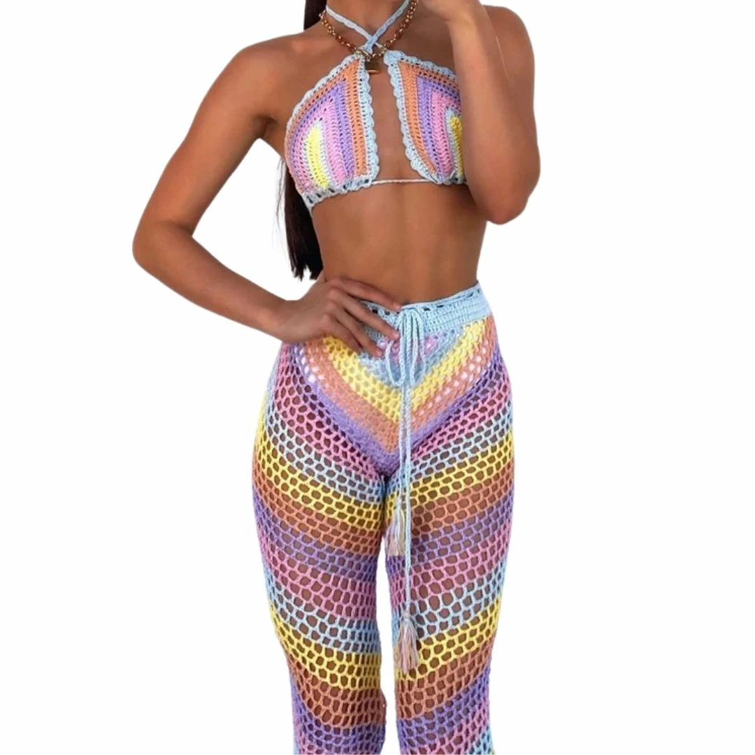 Consisting of a crochet bikini top which can also be worn as a halter top crossed at the front, and full length drawstring crochet trousers in gorgeous alternating blue, yellow, pink, peach and lilac stripes.
