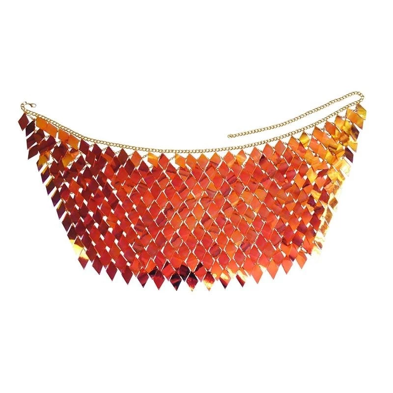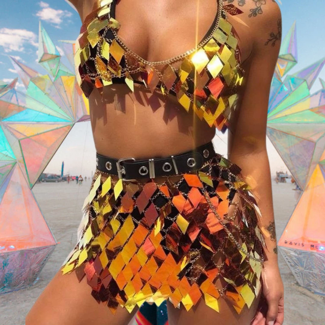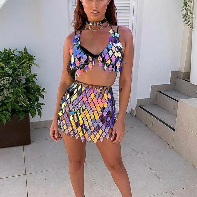 This super lightweight top and skirt set is the perfect sparkly layer for this festival season! Diamond shaped plastic disc sequins give the perfect amount of sparkle without being heavyweight, perfect layered over a crop top and shorts (or less!) for every festival and rave.