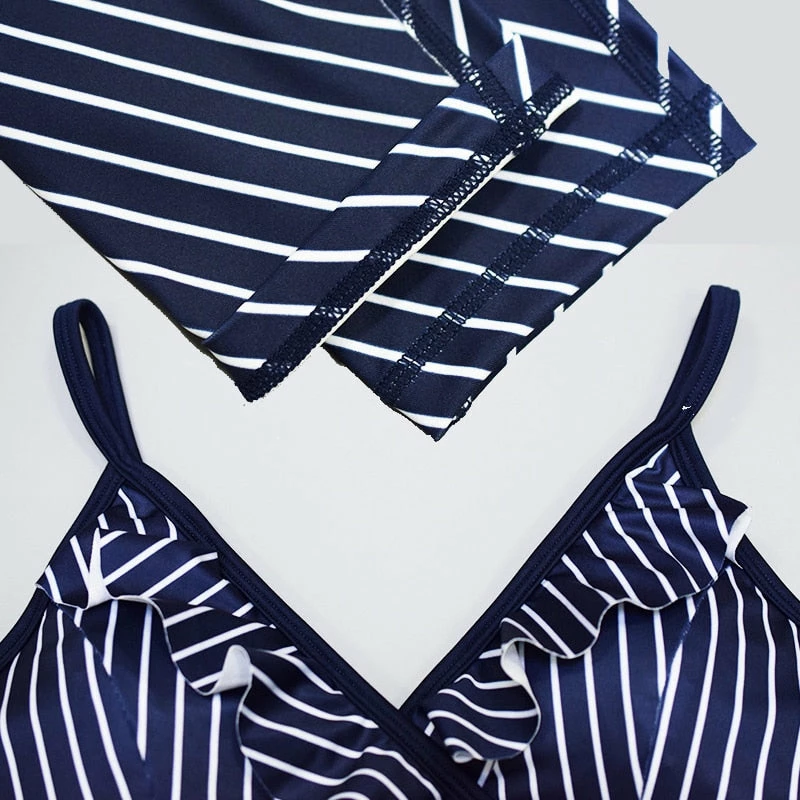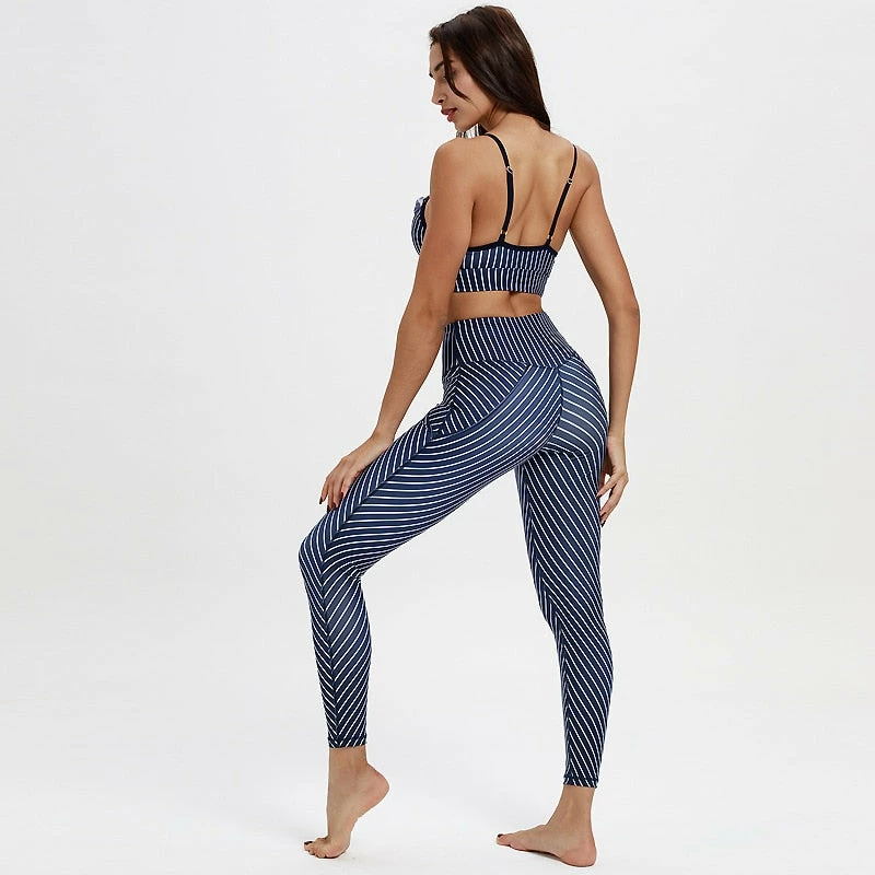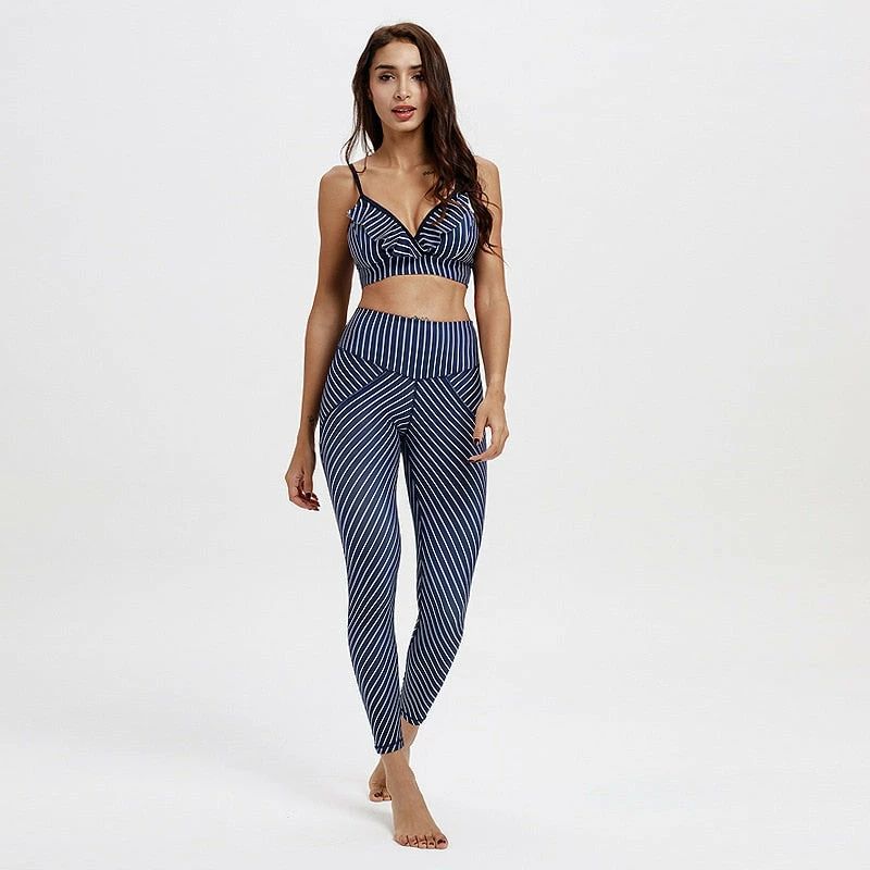 This cute pinstripe set comes in pink and navy blue with white stripes, spaghetti strap V-neck sport bra, and high waisted figure flattering leggings