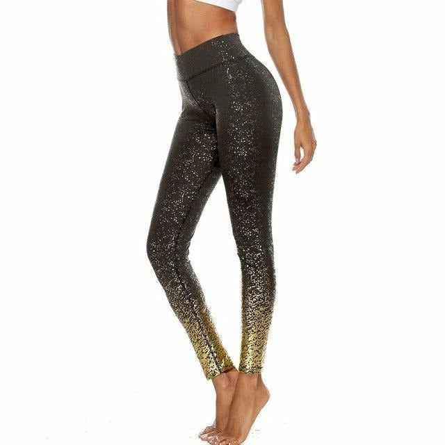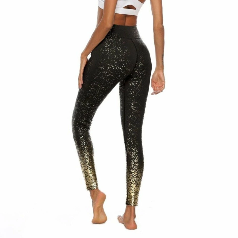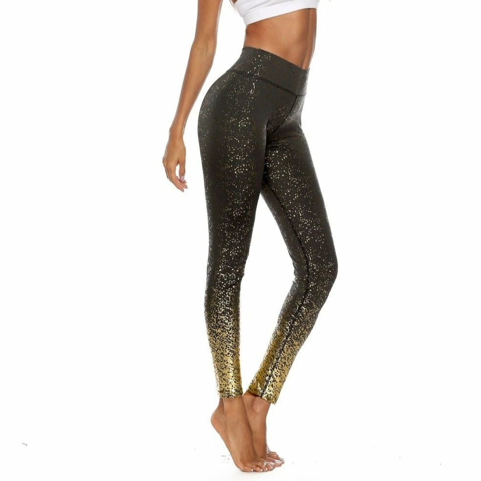 High waisted ankle length leggings with gold foil sparkle print.Â