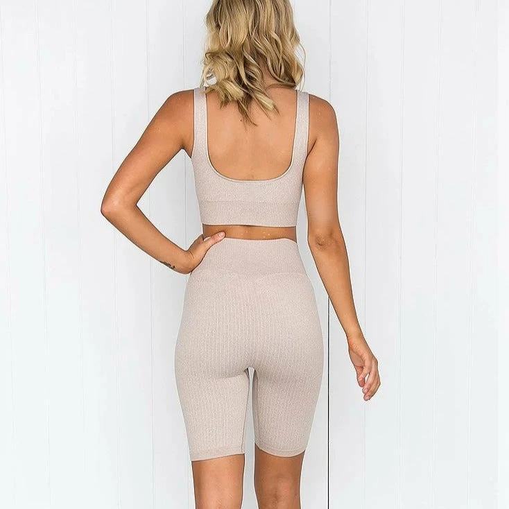 The most comfortable neutral yoga set perfect for lounging around after your workout. Fitted crop top and high waisted shorts in soft ribbed quick dry fabric.
