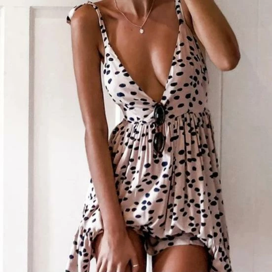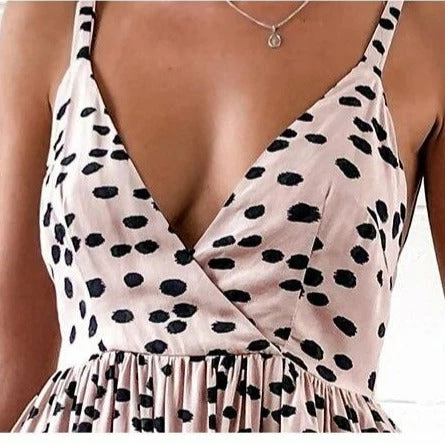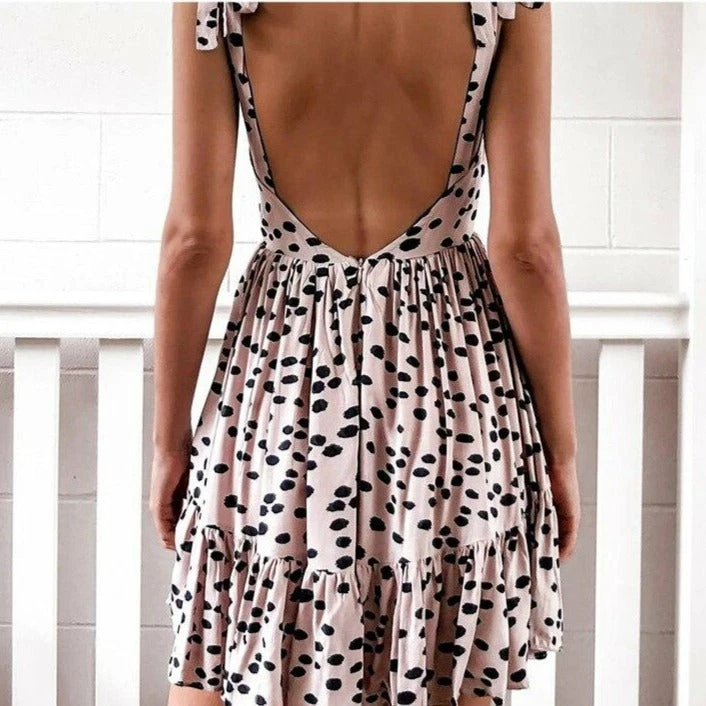 Flippy, flirty, frisky baby pink minidress with spaghetti straps, frill skirt, low cut back, bows on the shoulders, and v plunge neckline. Perfect Coachella or summer look!