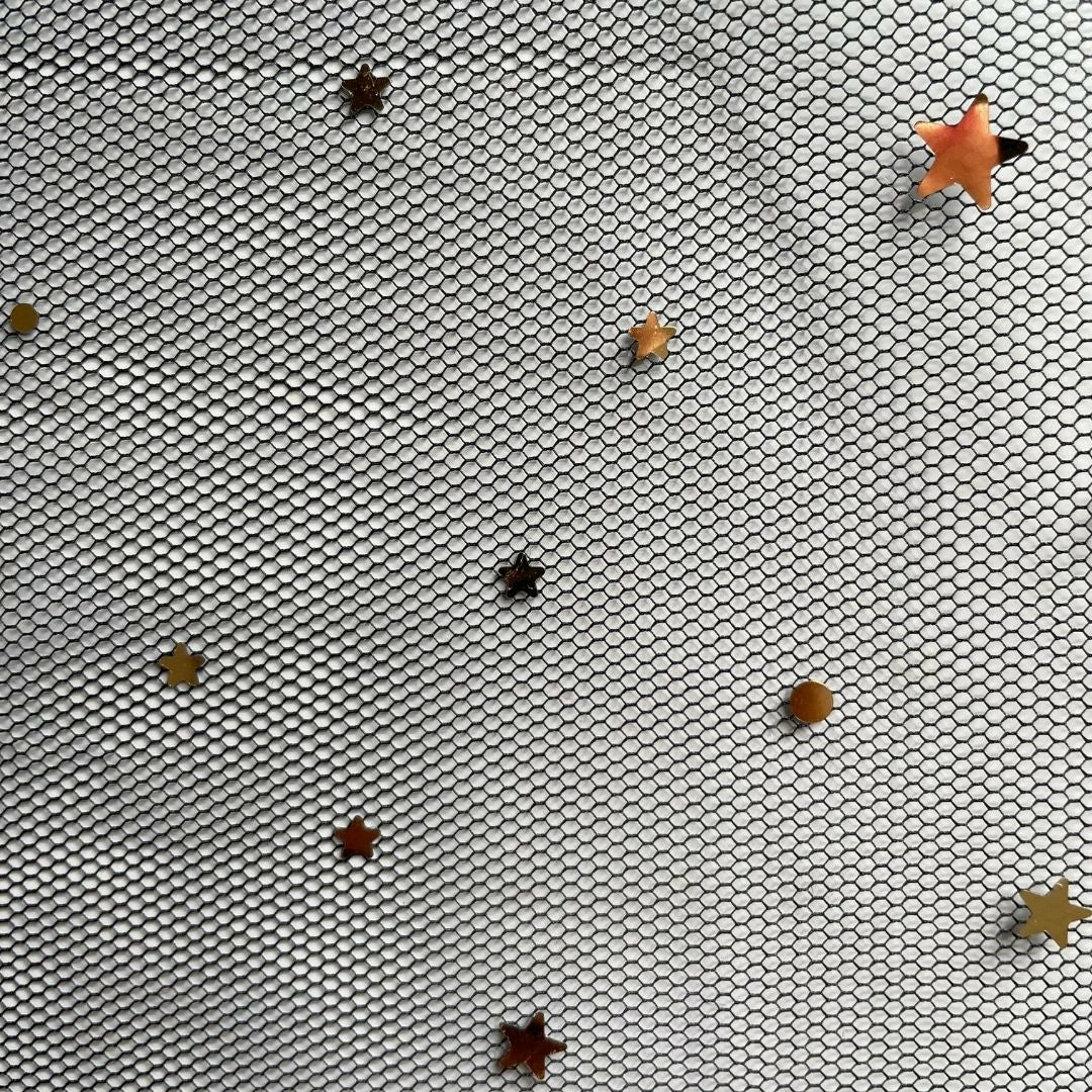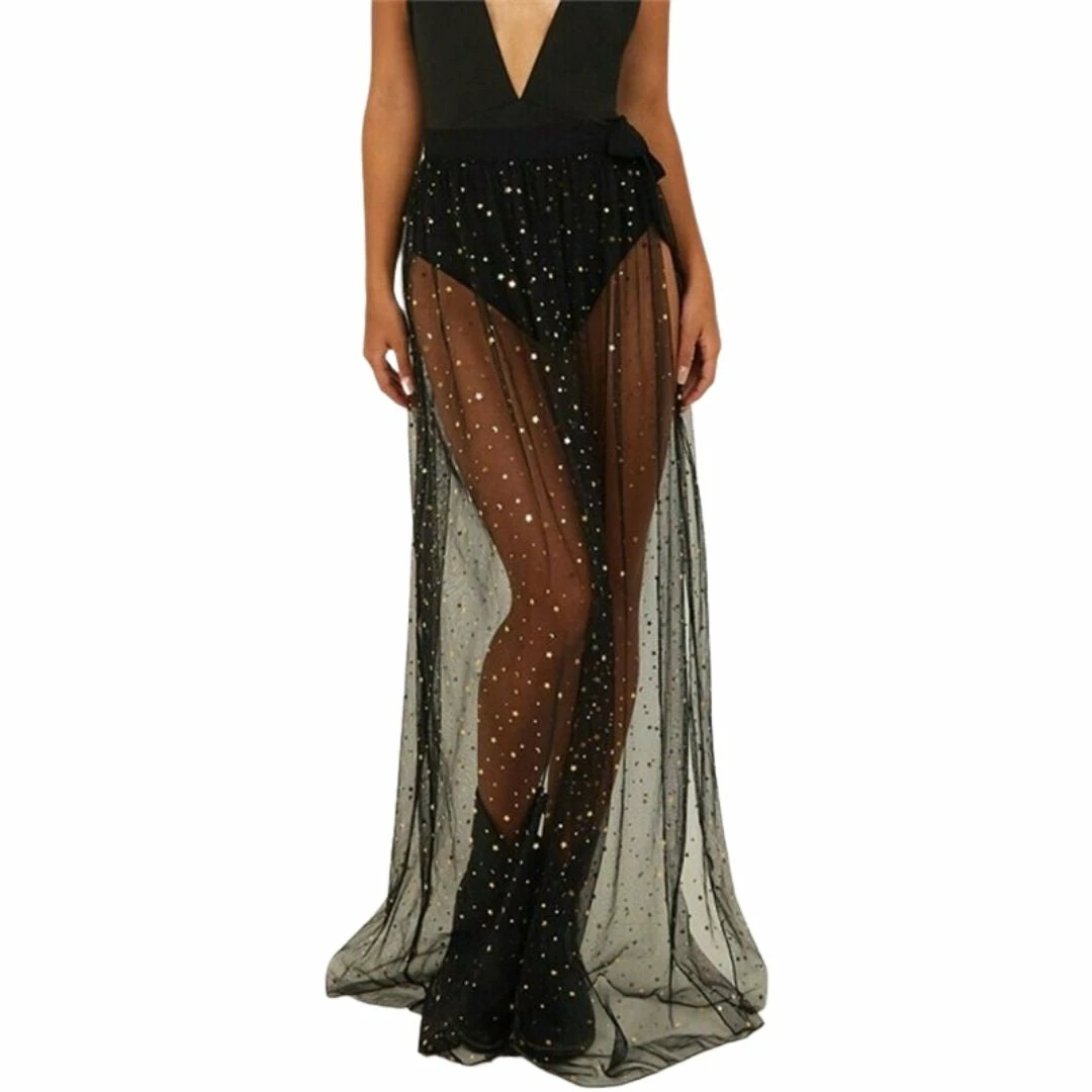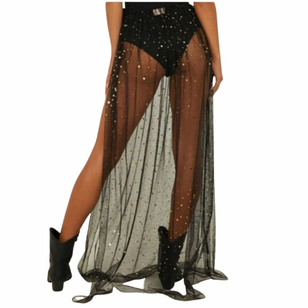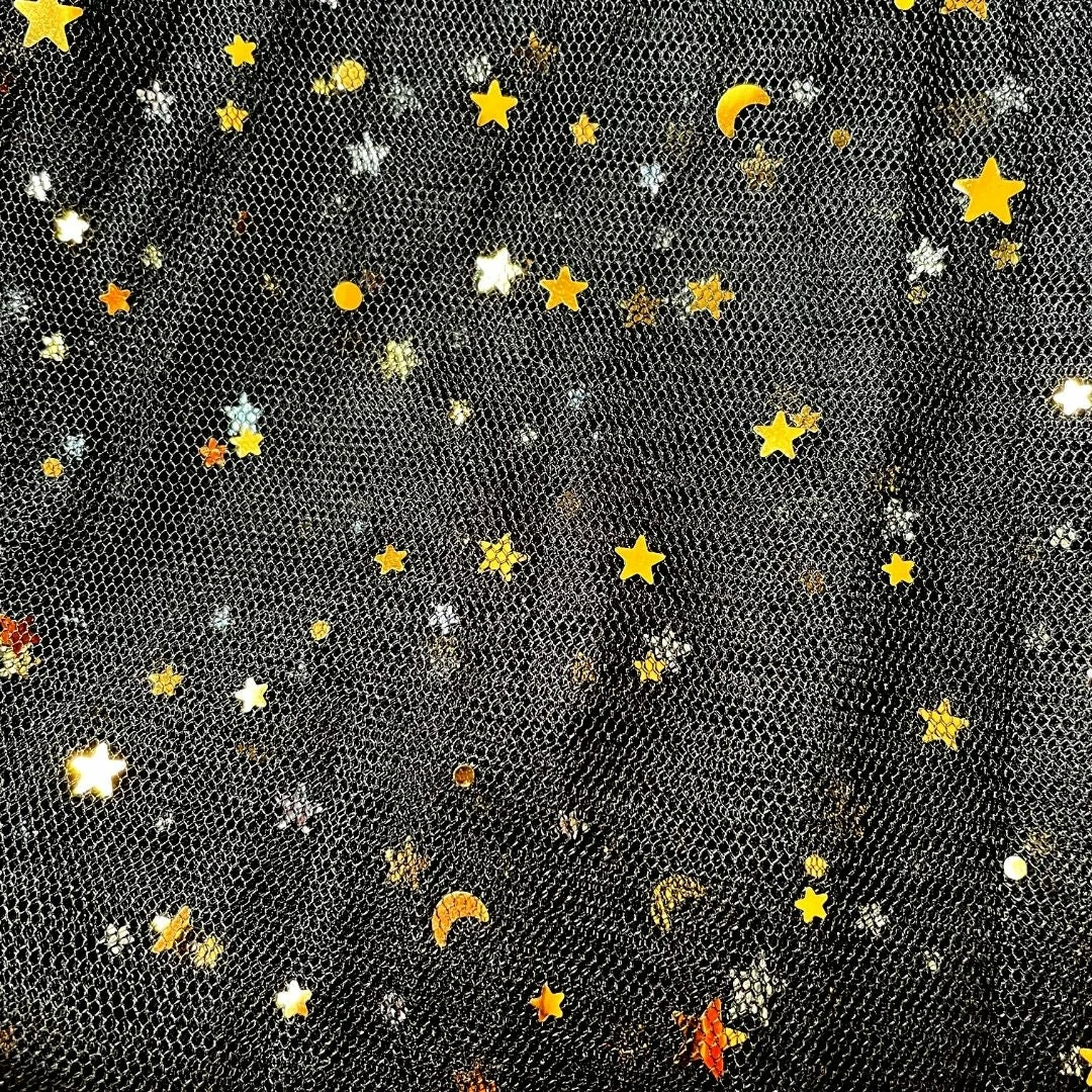 The simple design of fabric tie waist with a long mesh skirt overlay dotted with sparkly moon & stars is the perfect festival overlay when you want to dare to bare but not too much!Â